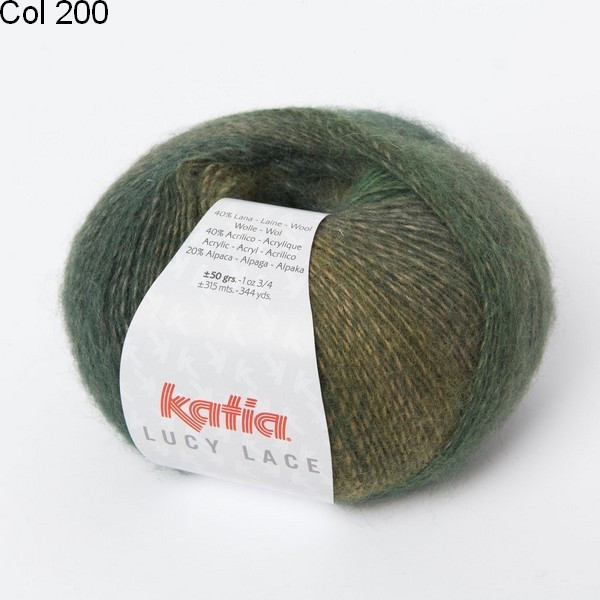 La laine Katia Lucy Lace est un fil constitué de 40% d'acrylique, 40% de Laine merino superwash et 20% d'alpaga superfin. 2 fils torsadés de différente couleur légèrement poilu. Très doux et très avantageux donnant un tricot léger et vaporeux.