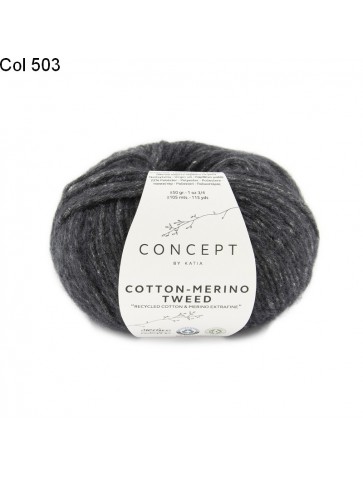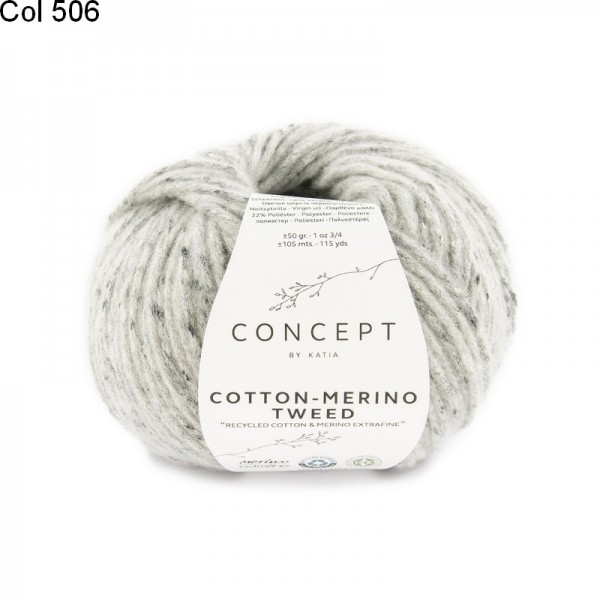 La laine Katia Concept Cotton Merino Tweed est un fil constitué de 53% de coton recyclé, 25% de mérions extrafin et 22% de polyester recyclé. Un âme de coton et polyester recyclé entouré de mérinos donnant un effet tweed et rustique.