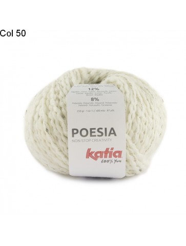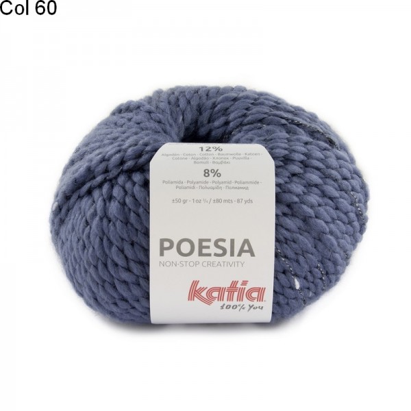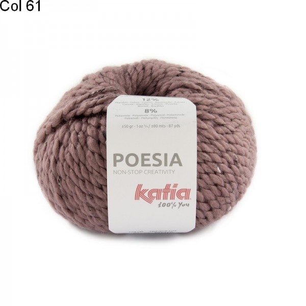 La laine Katia Poesia est un fil constitué de 40% d'acrylique, 40% de laine, 12% de coton et 8% de polyamide. Un brin de laine mèche entouré d'un fil de couleur différente. Pour un ouvrage moelleux et super doux.
