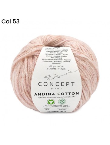La laine Katia coton ANDINA COTTON est un fil 73% coton biologique, 18% alpaga superfin et 9% polyamide.