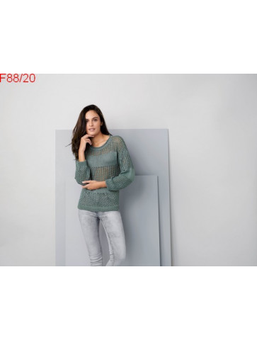 Pull à manche 3/4 avec des parties pleines et des parties ajourées, l'encolure est fait avec un petit rouloté