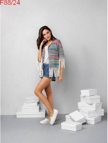Veste à manches 3/4 mult- couleurs avec une finition au point macramé avec des franges. Réalisée avec 2 cotons.