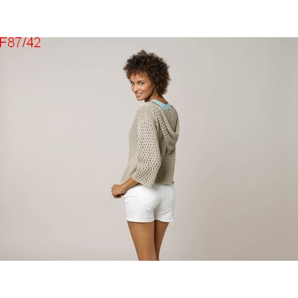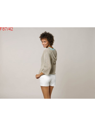 Pull à manches 3/4 avec une capuche, col en V. Il est tricoté au point ajouré.