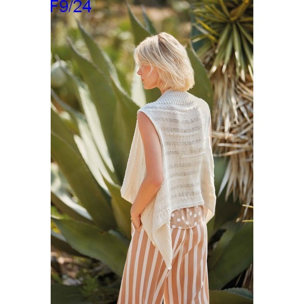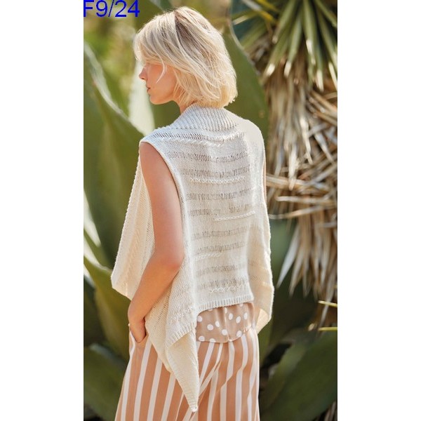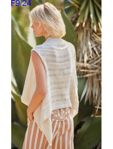 Gilet sans manche, sans bouton avec les devants tombants. Réalisé aux aiguilles en une seule pièce avec un beau point fantaisie et de jolies broderies.